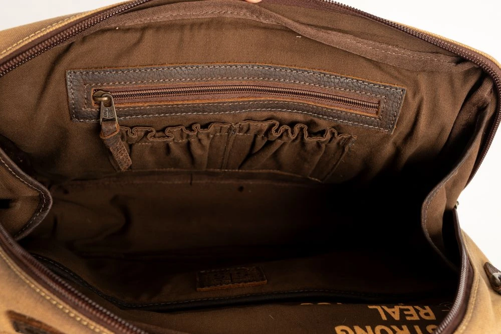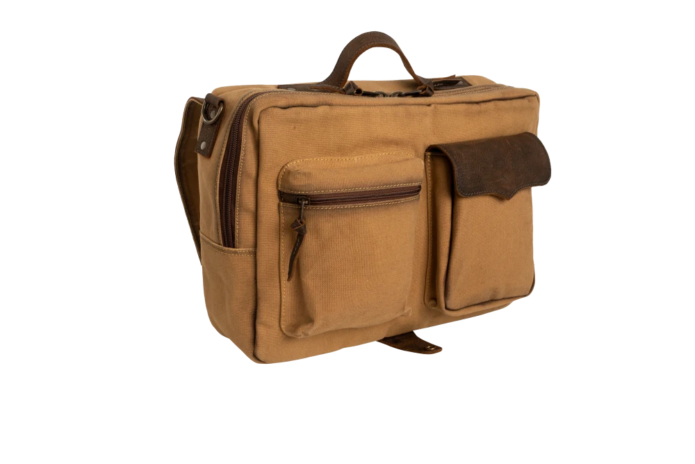 - Durable, waxed cotton canvas shell with genuine leather accents