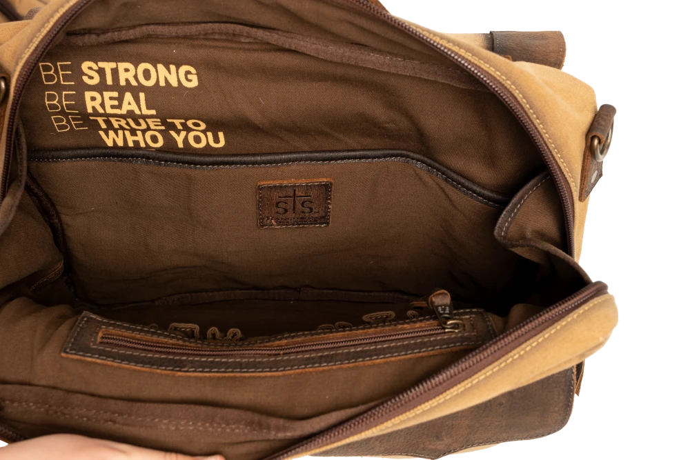 - Top distressed leather carry handle stamped with “STS Ranchgear” ; removable canvas shoulder strap with leather pad stamped with “STS Ranchgear”