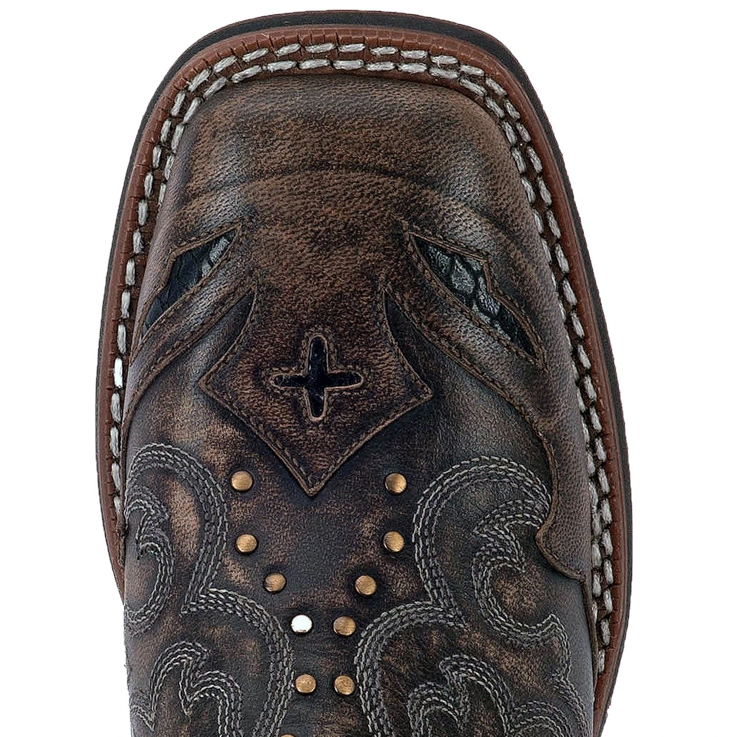 Inspiration in every detail! This is a gorgeous boot meticulously designed by Laredo. Made from sanded goat leather with underlays of a snake print, cushioned insole and rubber outsole. Definitely rustic with brass accents and stitching throughout.