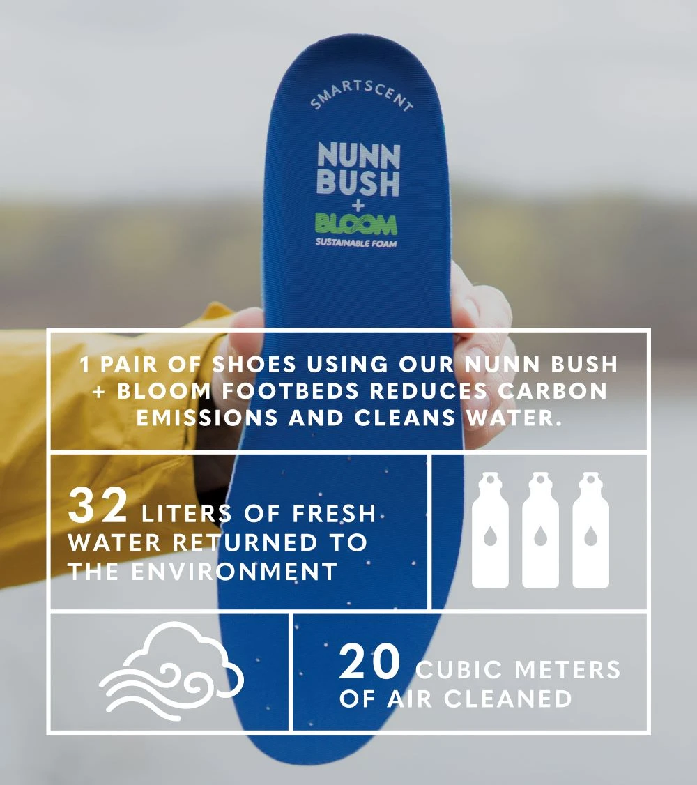 - Footbed created with 20% BLOOM, and algae-based product, which will return 32 liters of clean water to habitats and clean 20 cubic meters of air