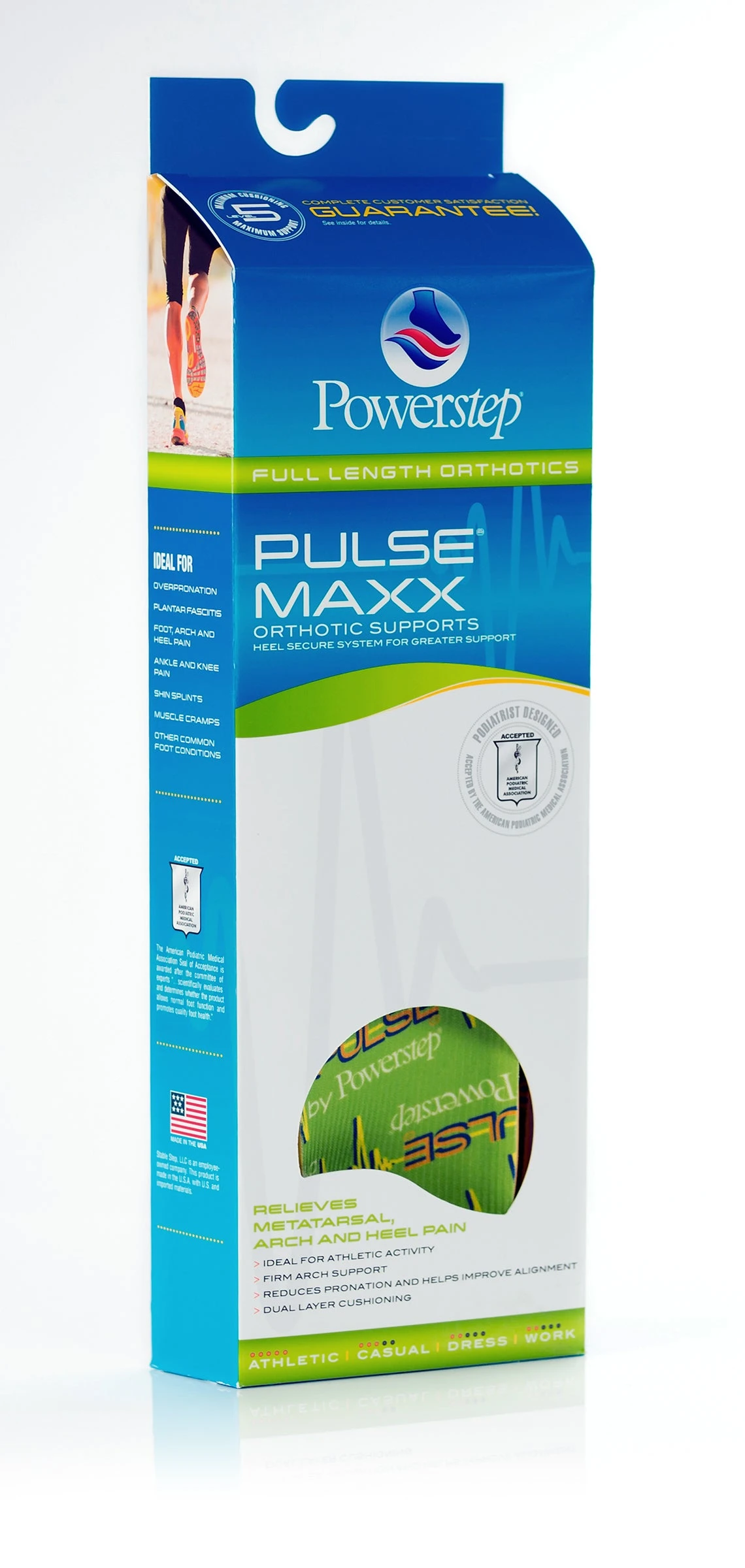 The PowerStep® PULSE® line of shoe insoles were designed specifically for use in advanced running shoes during rigorous athletic activity. The PowerStep PULSE Maxx Support full length insoles have a unique design with a firmer shell and angled heel platform for greater correction and arch support. The built-in neutral arch support and heel cradle stabilizes the foot and improves alignment. This motion control along with targeted dual-layer cushioning helps absorb shock at impact to reduce stress on the feet, ankles, joints, and tendons.