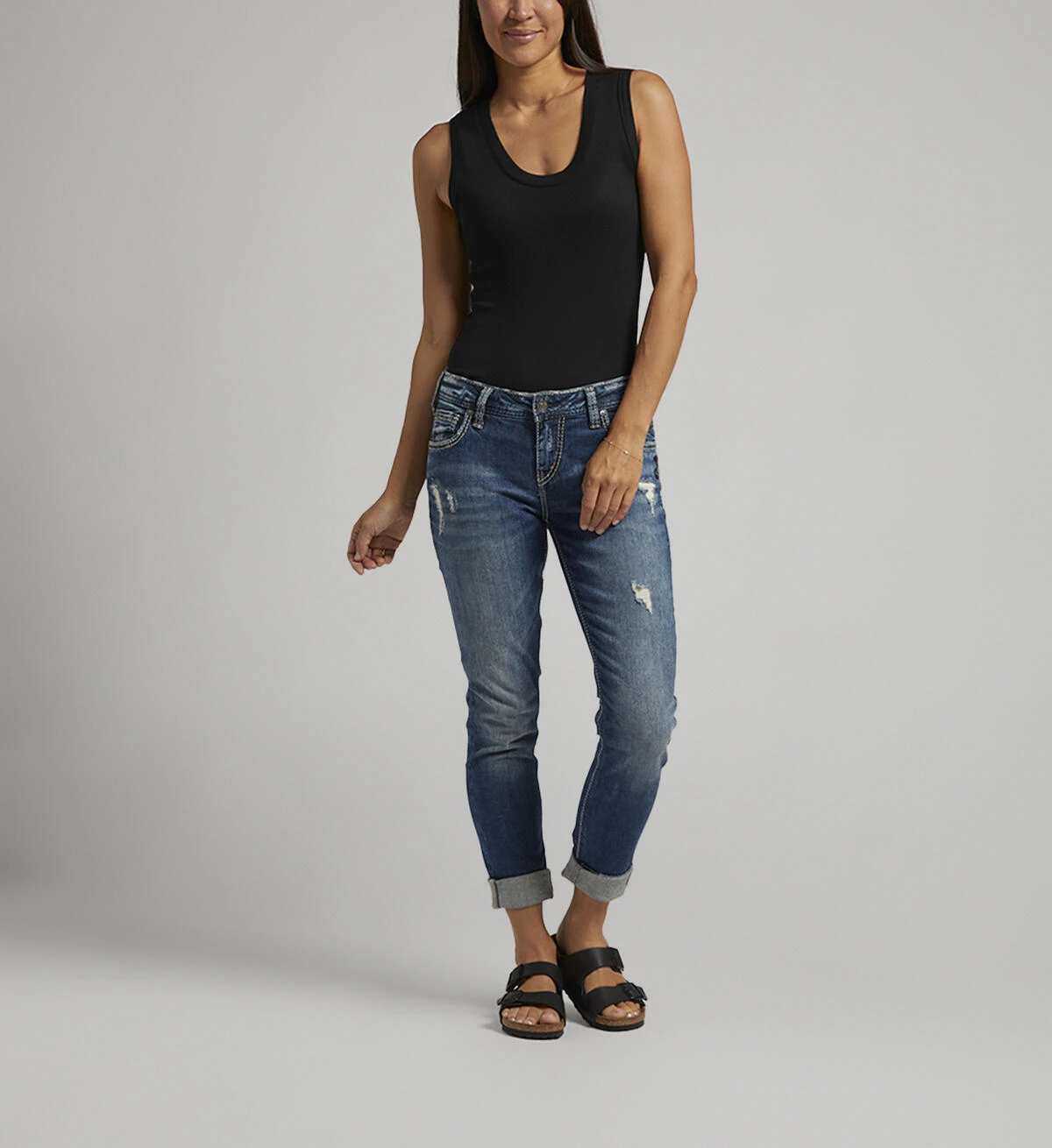 - Mid stretch denim offers a comfortable fit that doesn’t cling to the body